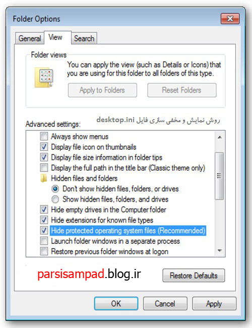 همونطور که عرض کردم خدمت تون فایل desktop.ini یک نوع فایل سیستمی در ویندوزه که وظیفه ش سفارشی کردن پوشه هاست . desktop.ini هم مانند سایر فایل های سیستمی تحت حفاظت ویندوزه و به طور پیش فرض مخفیه ! گاهی وقتا دوس دارید که در این فایل تغییراتی ایجاد کنید اما خوب این فایل ها قابل روئیت نیستن که بتونید بازشون کنید بنابراین لازمه بدونید که این فایل رو چطور نمایش بدین . برای این کار یک پنجره در Computer باز کنید و بعد از منیوی Organize رو گزینه Folder and Search options کلیک کنید . در پنجره ای که باز شده به تب ( سربرگ ) View برید و گزینه Hide Protected Operating System Files رو پیدا کنید . توجه داشته باشید که اگر تیک این گزینه رو بردارید همه فایل های سیستمی مخفی ، نمایش داده میشن و اگر این گزینه رو تیک بزنید دوباره همه فایل های سیستمی مخفی میشن !